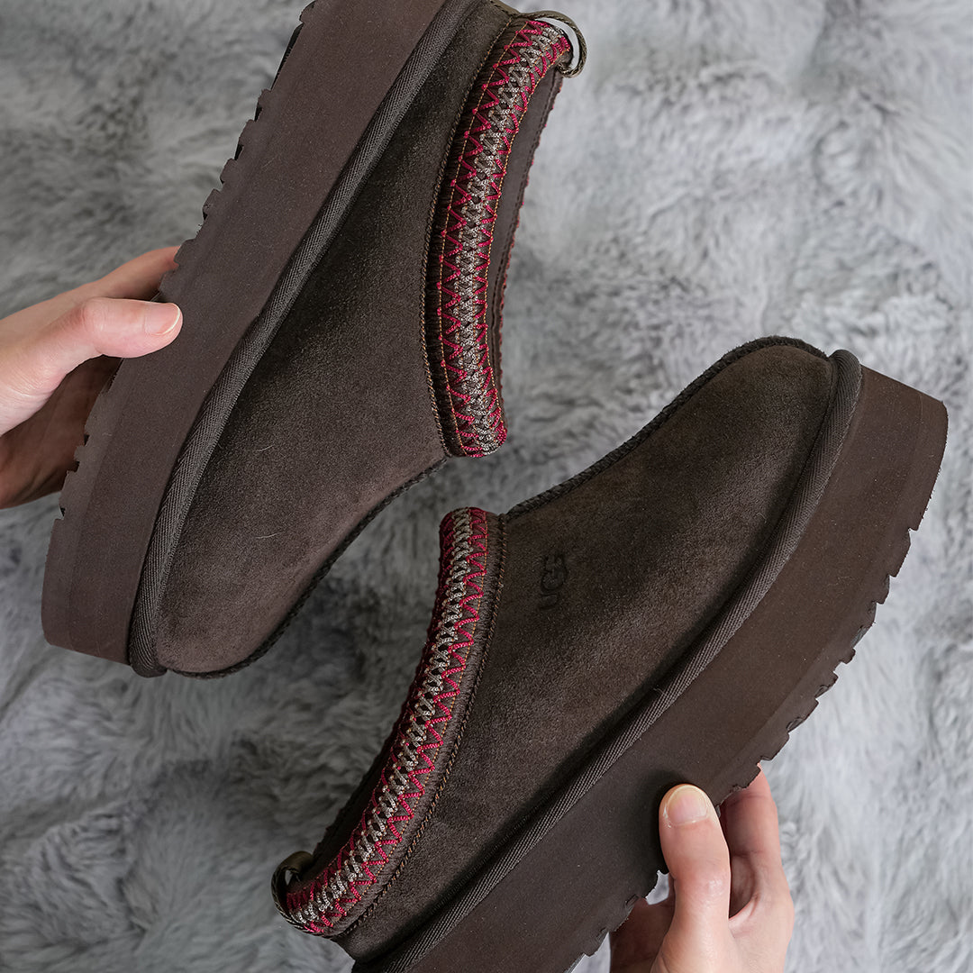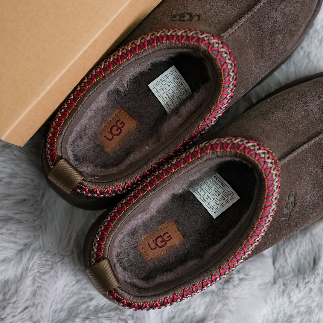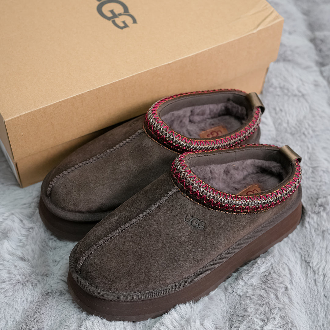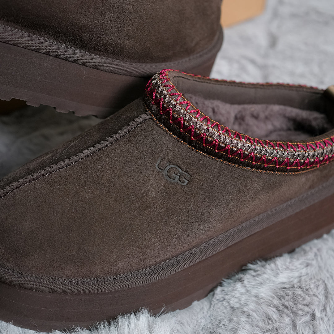 The Women's UGG Tazz Slipper II 'Dusted Cocoa' comfortable chunky-soled slippers feature a soft suede sheepskin lining and lightweight rocker sole, delivering all-day comfort whether indoors or out.